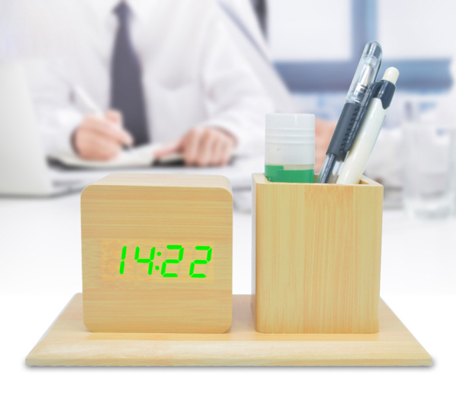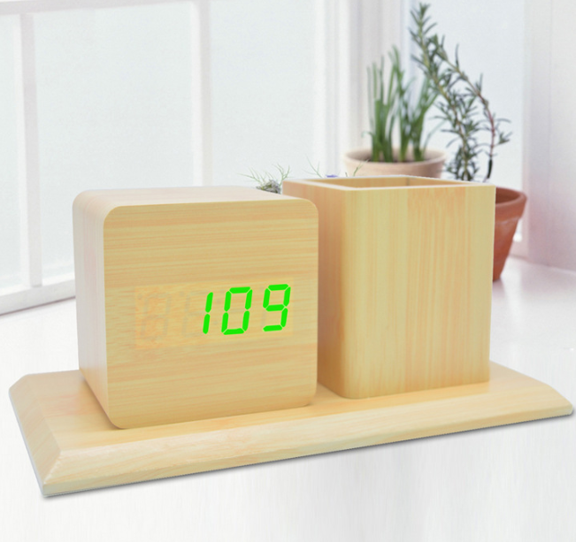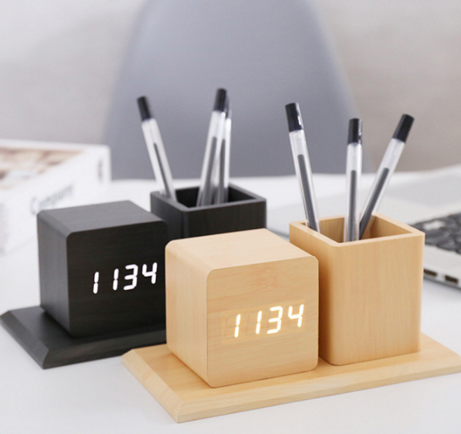 创意桌面办公电子笔筒钟LED木头钟 静音声控平底木头电子闹钟